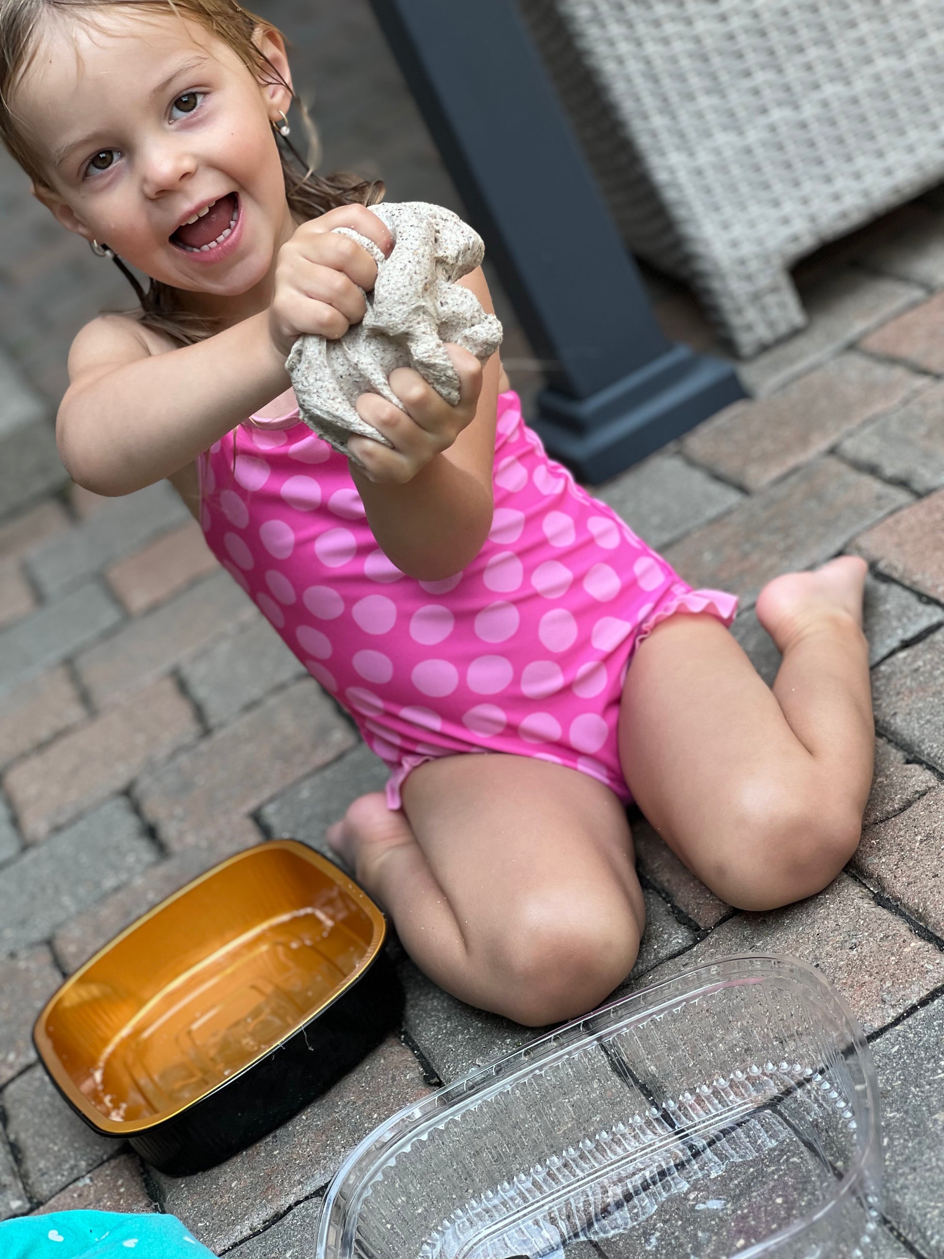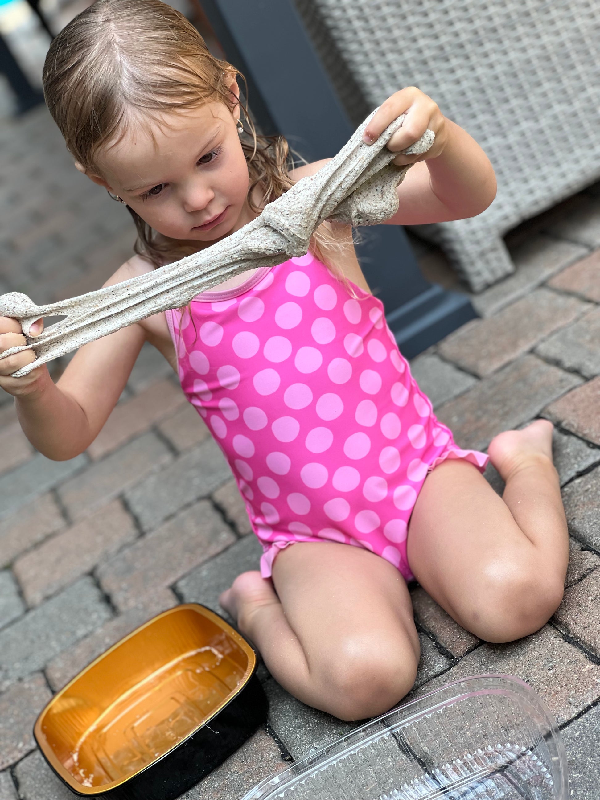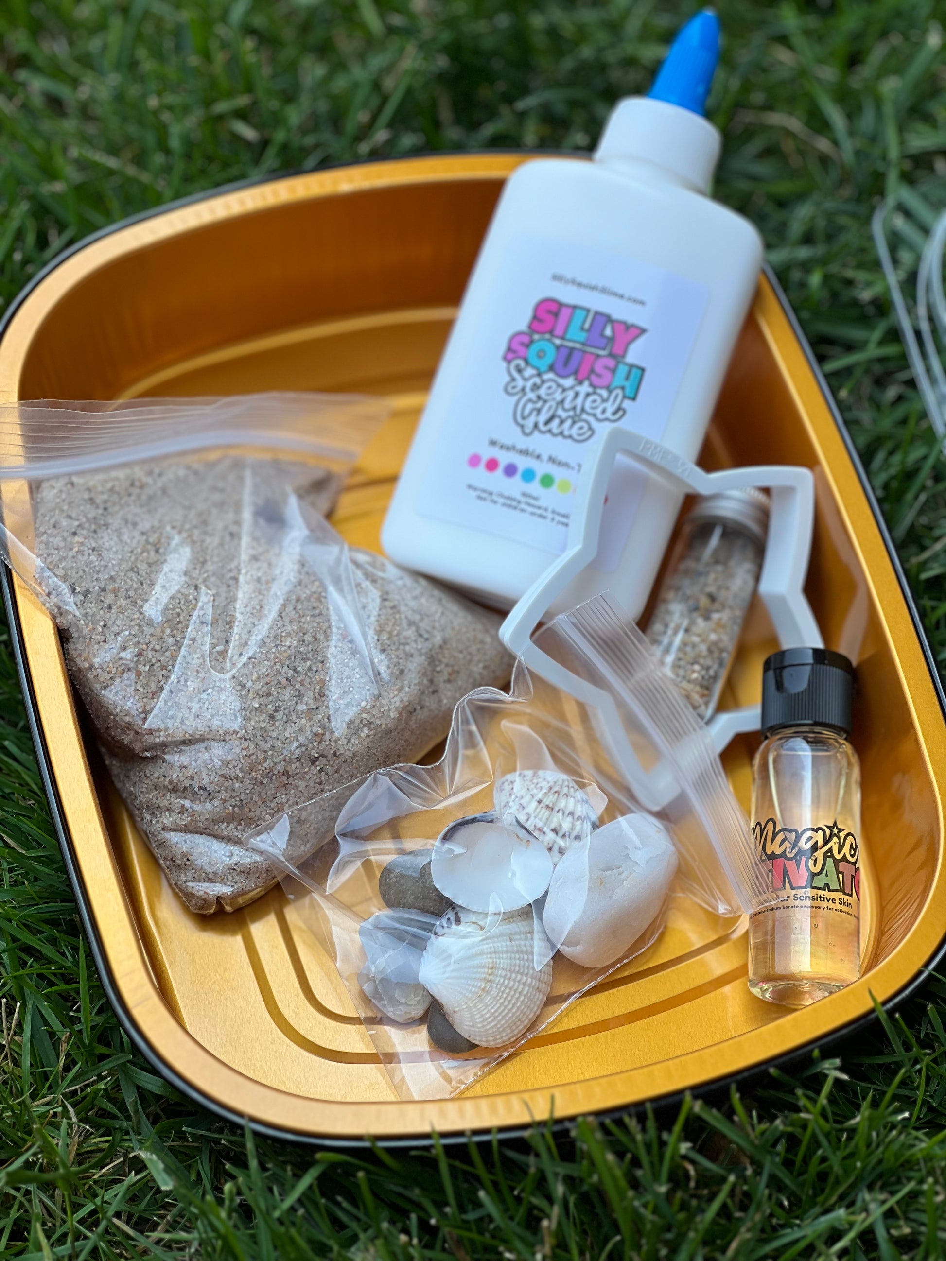 The kits contains everything you need to make super sensory Sand Slime. Makes a fun outdoor activity!