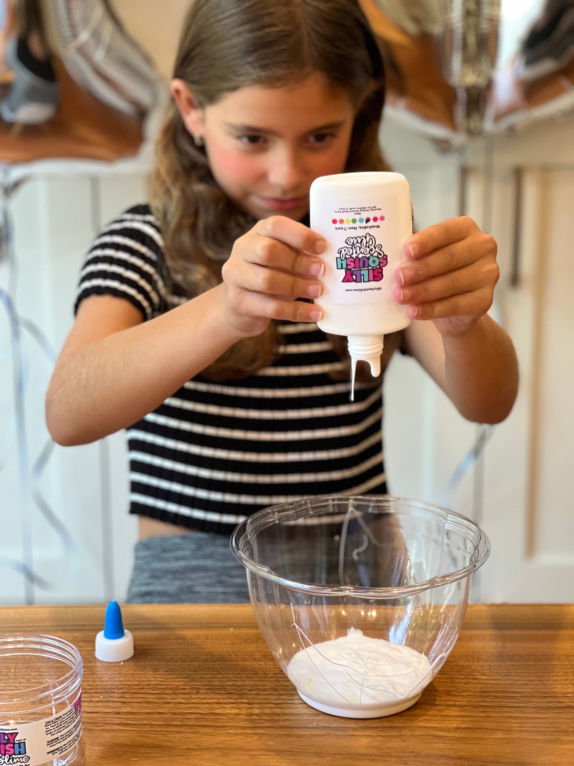 Includes everything you need to make perfectly soft and stretchy butter slime in about 30 min! Perfect gift or birthday party activity. Follow along with the step-by-step YouTube instructions lead by our eldest daughter (AKA “Slime Time Lyla!”).  All you need is a clean, non-porous work surface.